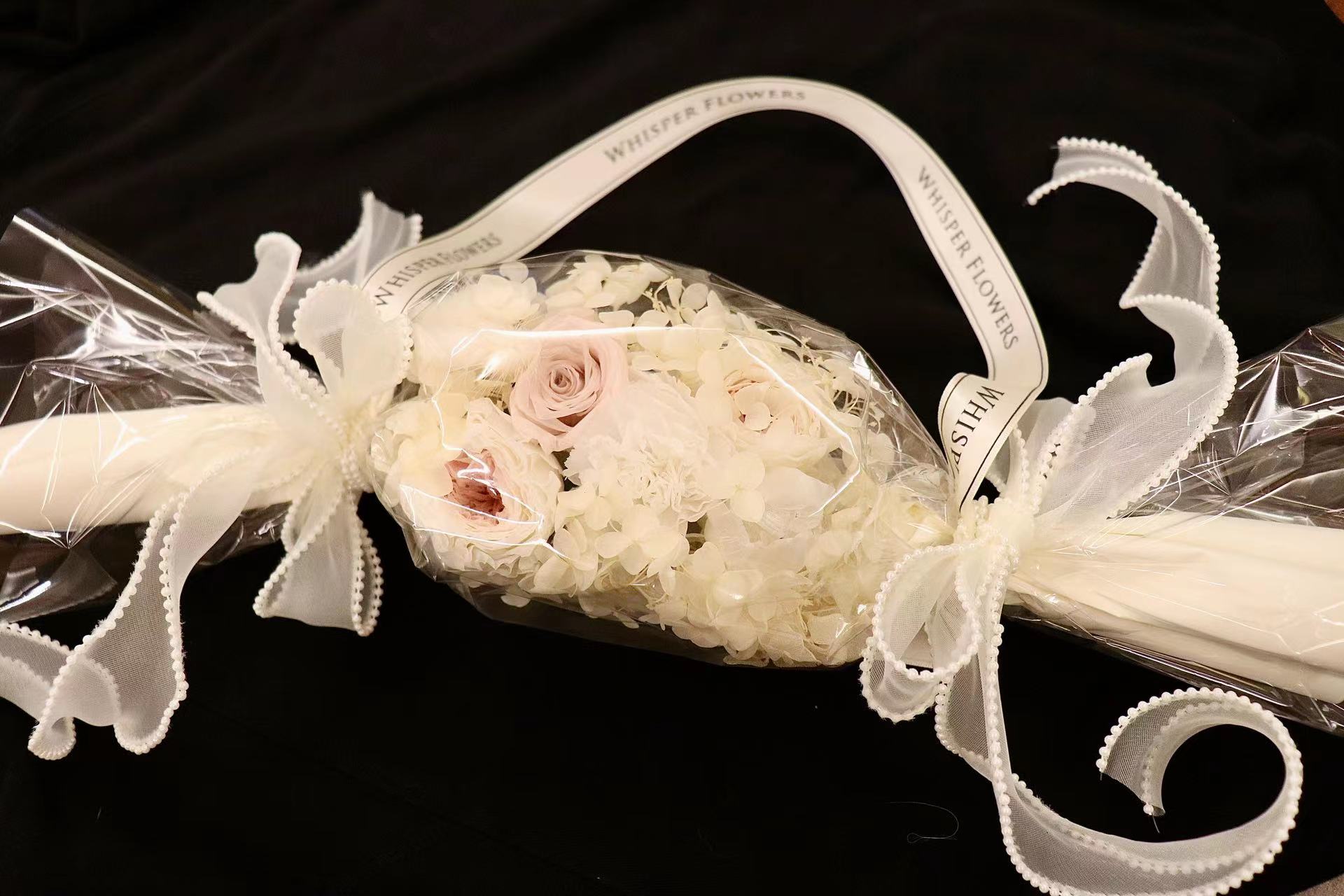 Indulge in the exquisite allure of our Candy Preserved Flower, meticulously curated with a harmonious medley of premium preserved Austin roses, delicate roses, tulips, lush hydrangeas, and whimsical bunny tails.