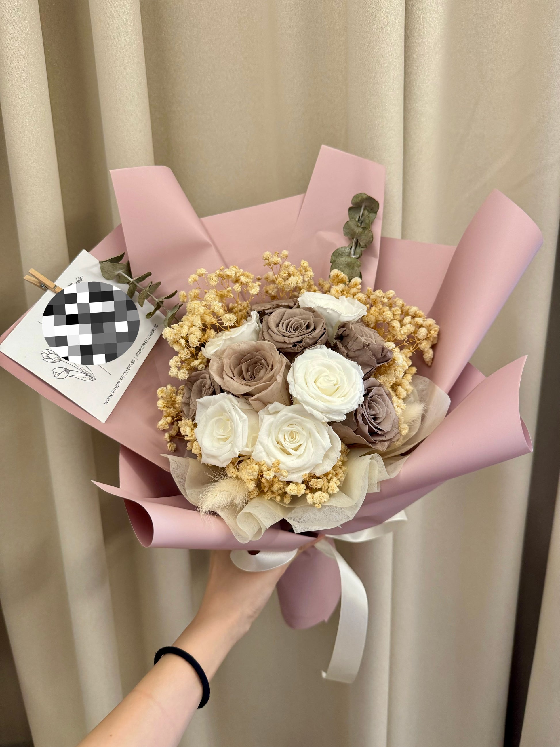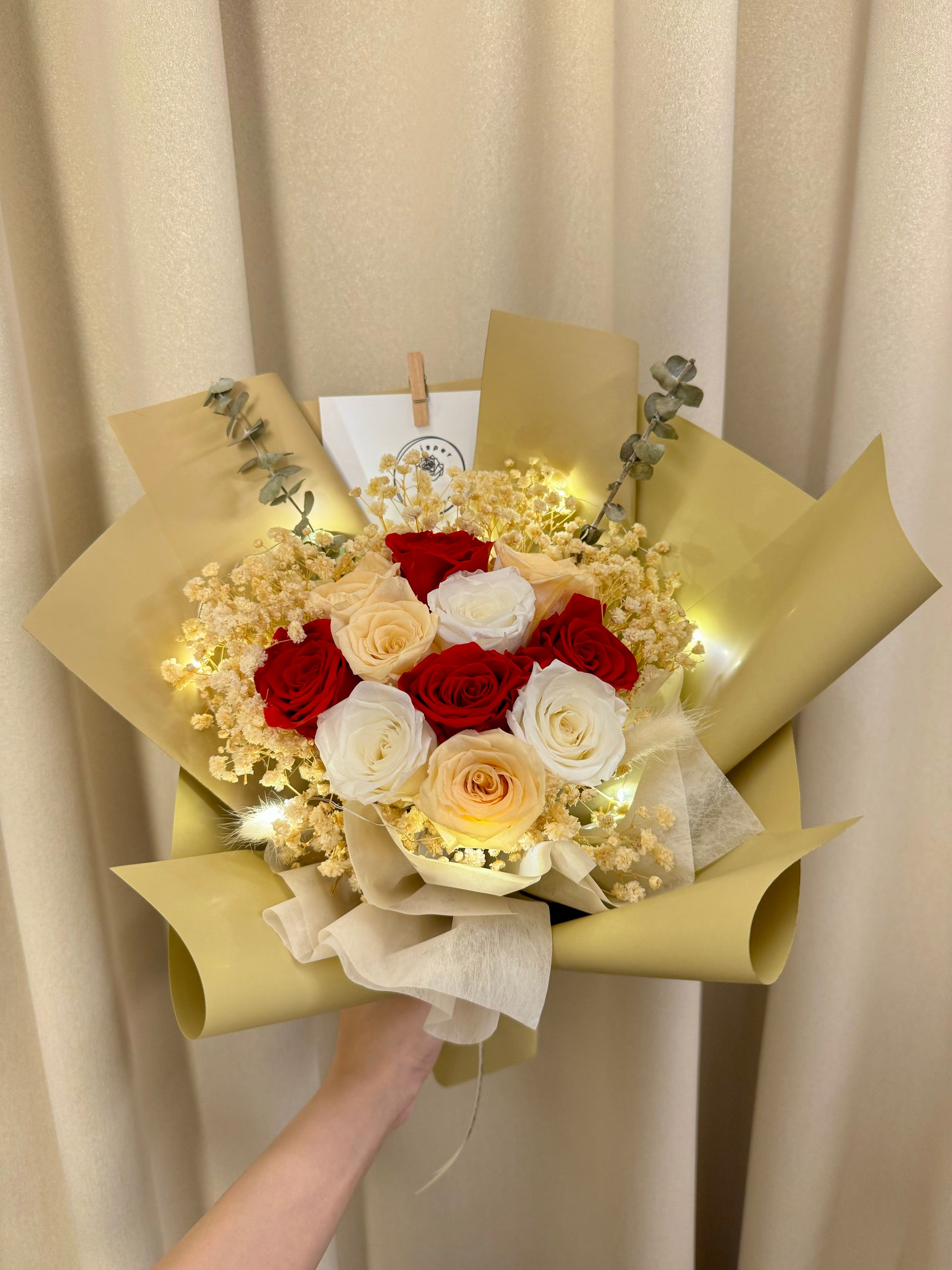 Mixed Color 6/9/12 Stalks Preserved Roses Bouquet w/ Baby Breathes, Bunny Tail and Eucalyptus