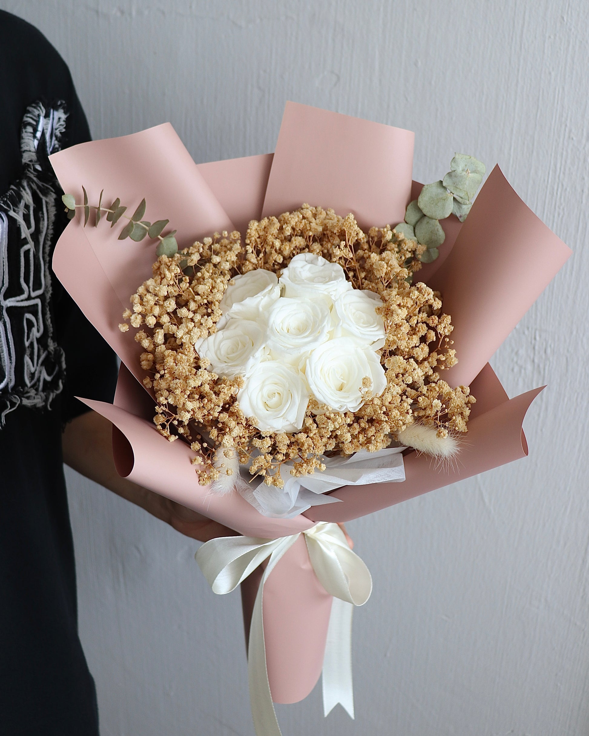 3/5/8 Stalks Preserved White Roses Bouquet w/ Baby Breathes, Bunny Tail and Eucalyptus