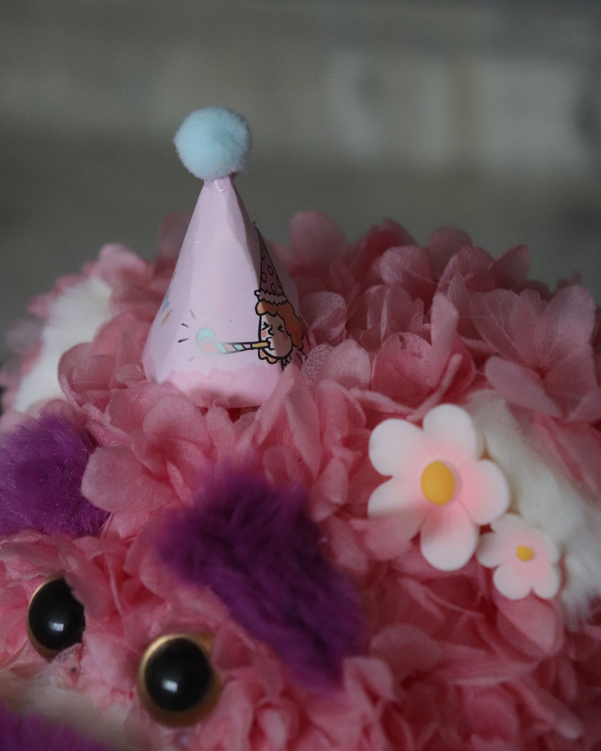 Delicately arranged by hand, this piece is made of Preserved Hydrangeas, a beautifully crafted Strawberry Bear Figurine where preserved flowers meet a figurine.